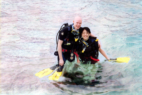 Michael and Elisa going on one of our first beach dives. The tanks felt so heavy as we hauled them on our back across the beach but once we entered the water it was smooth sailing. The water was crystal clear and warm at 83 degrees. The diving was sublime.